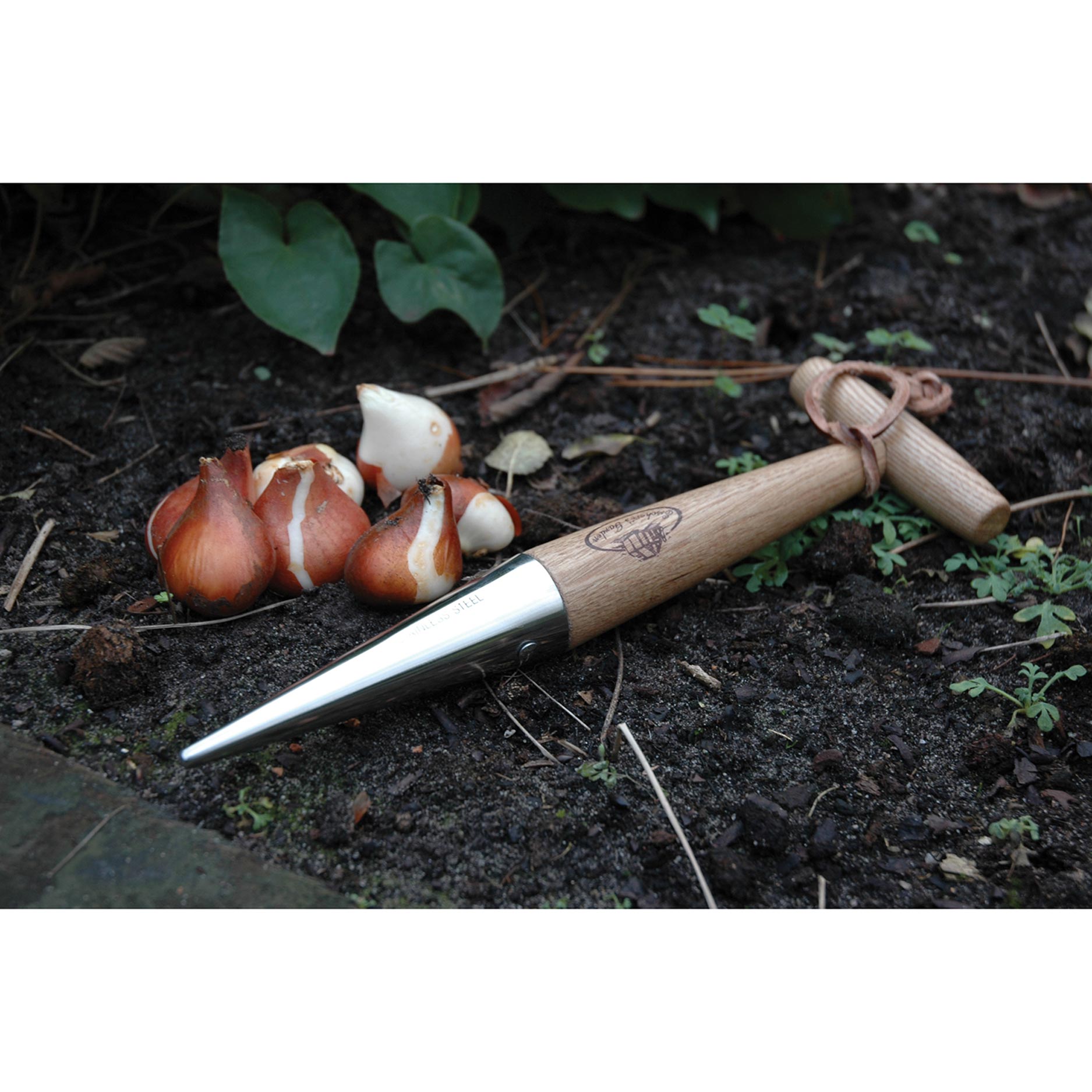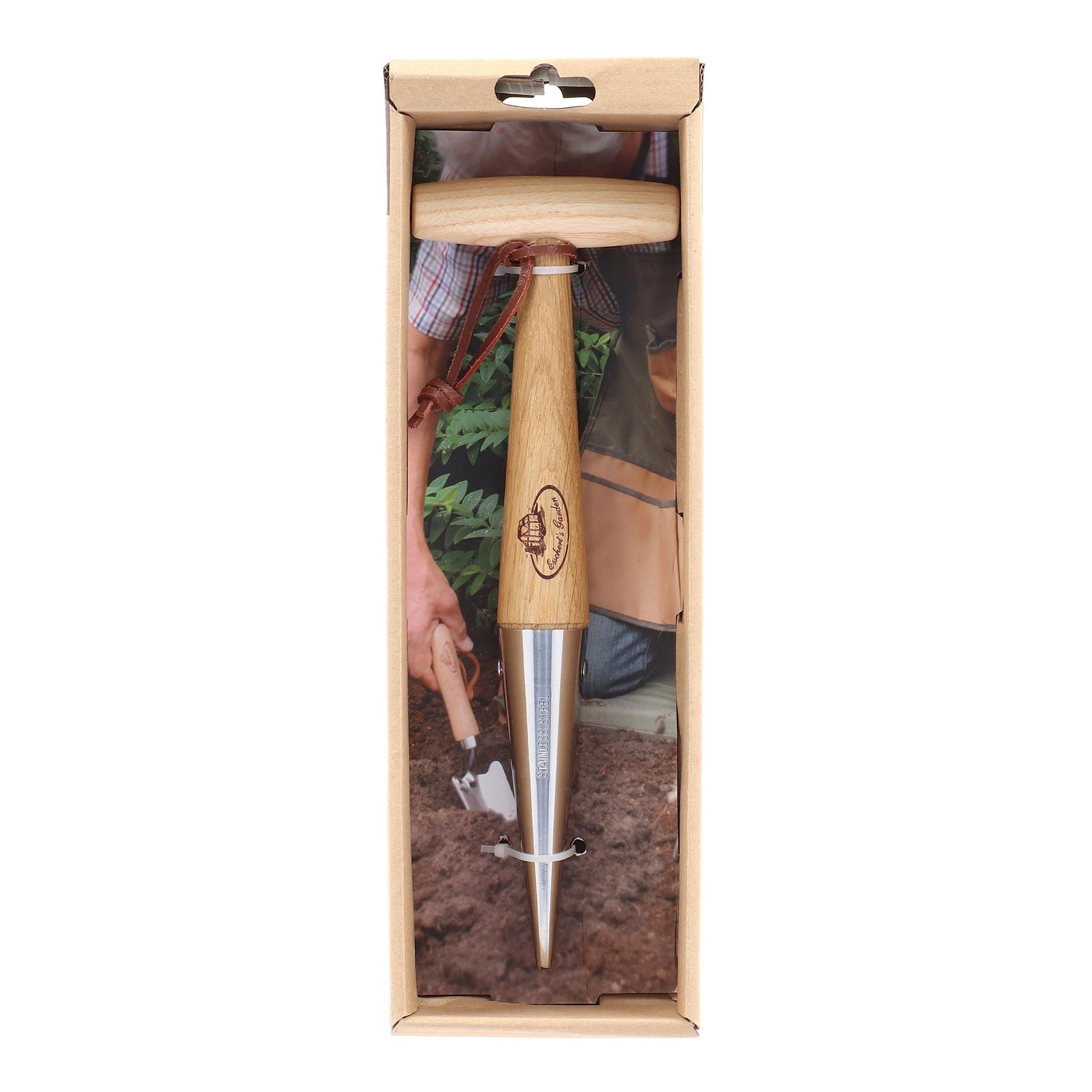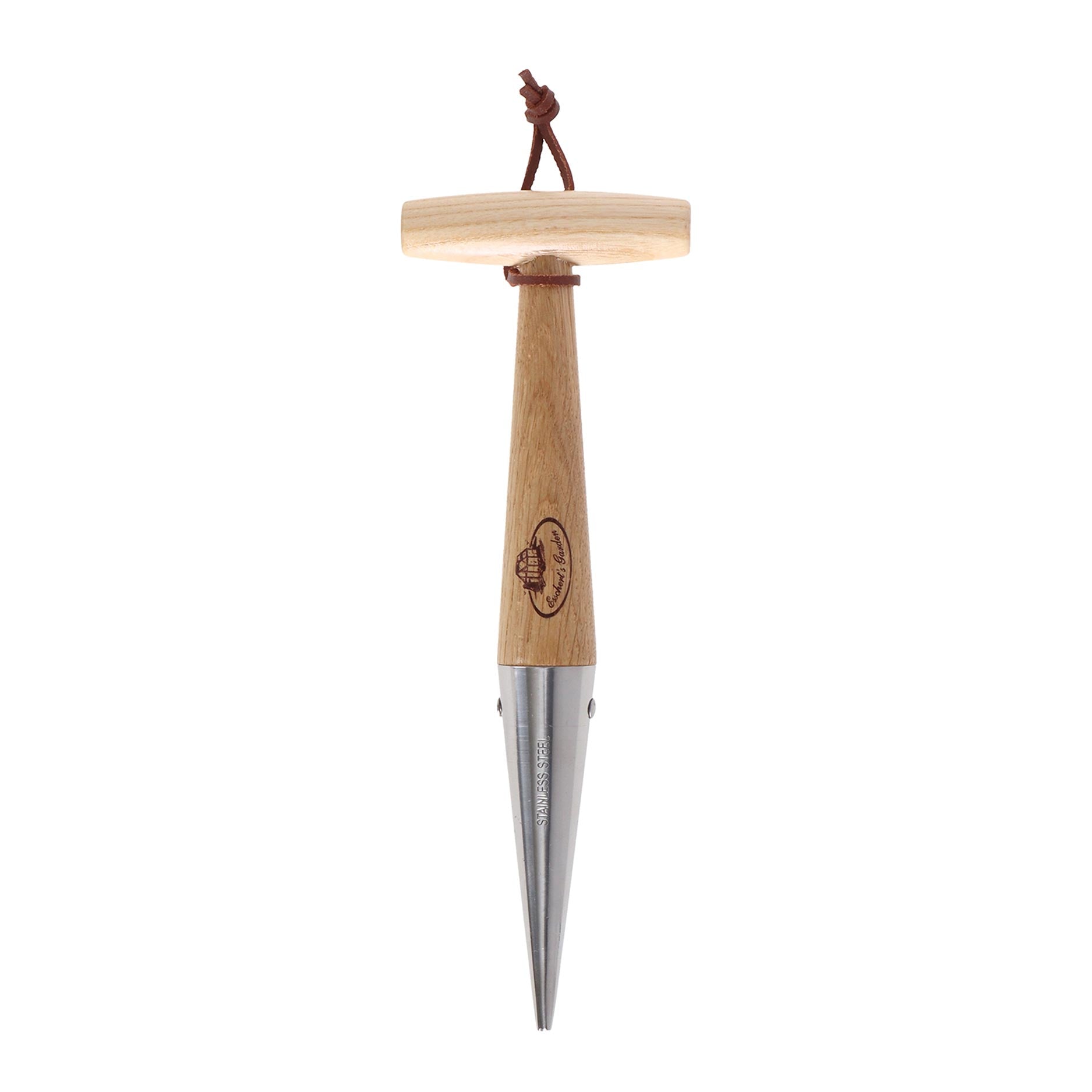 Der Pflanzstock aus rostfreiem Stahl ist traditionelles Gartengerät für alle, die einen grünen Daumen haben, und ideal für das präzise Pflanzen von Blumenzwiebeln und Jungpflanzen. Mit diesem Werkzeug stechen Sie mühelos saubere Pflanzlöcher in den Boden, sodass Sie schnell und kontrolliert arbeiten können. Der Pflanzstock ist aus rostfreiem Stahl mit Eschenholz gefertigt und mit Rindsleder in Form einer Leder-Aufhängeschlaufe verarbeitet. Der ergonomische T-Griff sorgt für einen angenehmen Halt und zusätzliche Kontrolle. Das Ganze wird in einer offenen Geschenkbox geliefert, was ihn zu einem schönen Präsent macht.