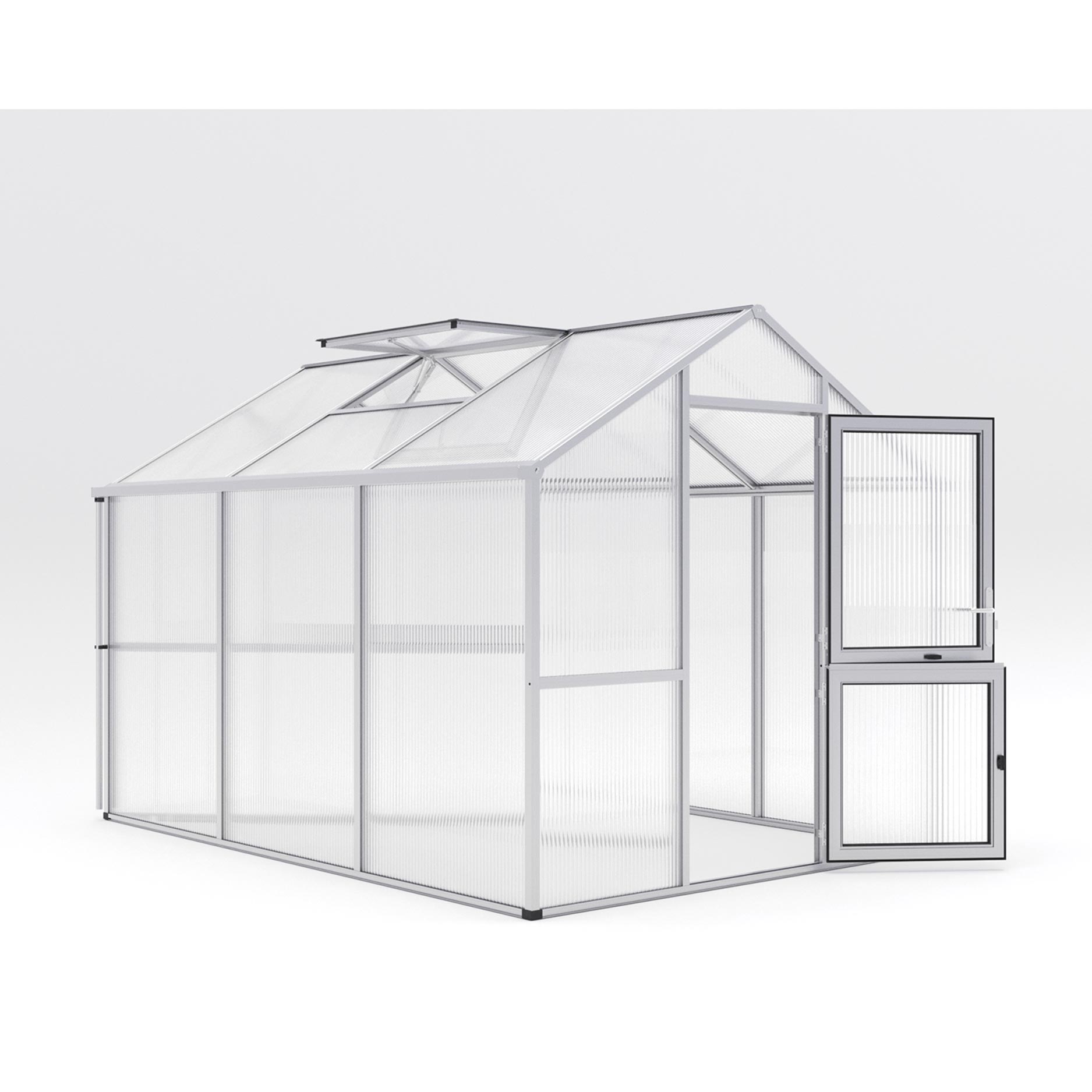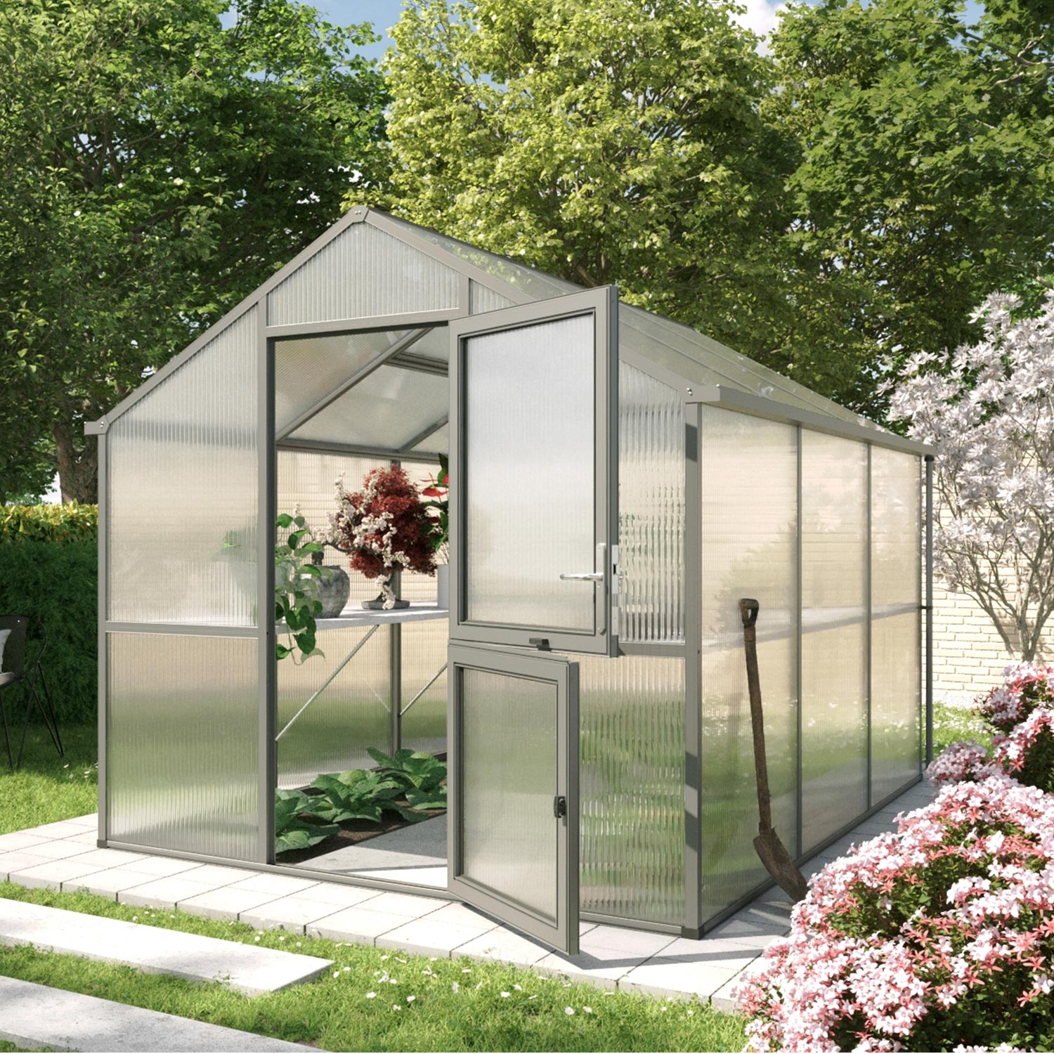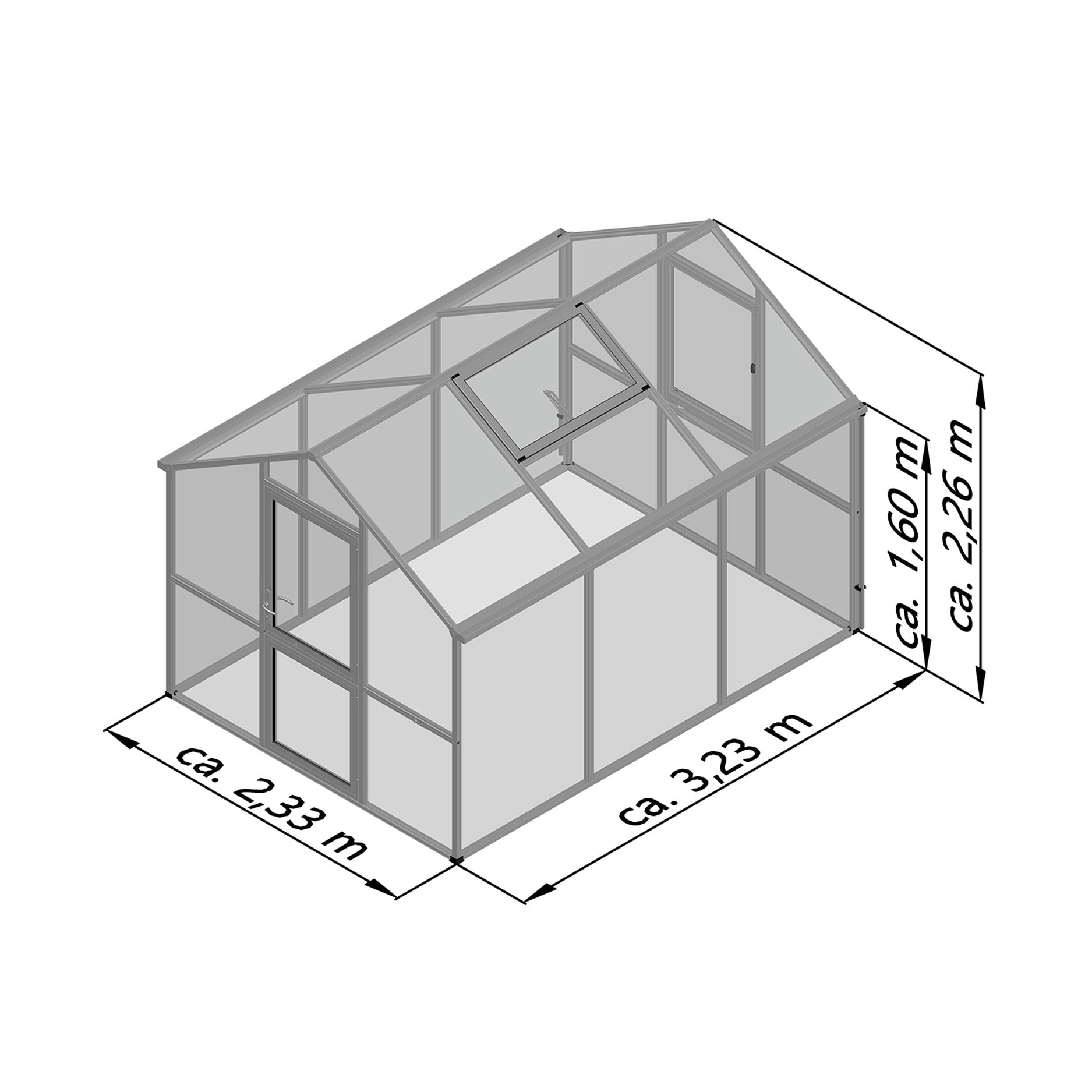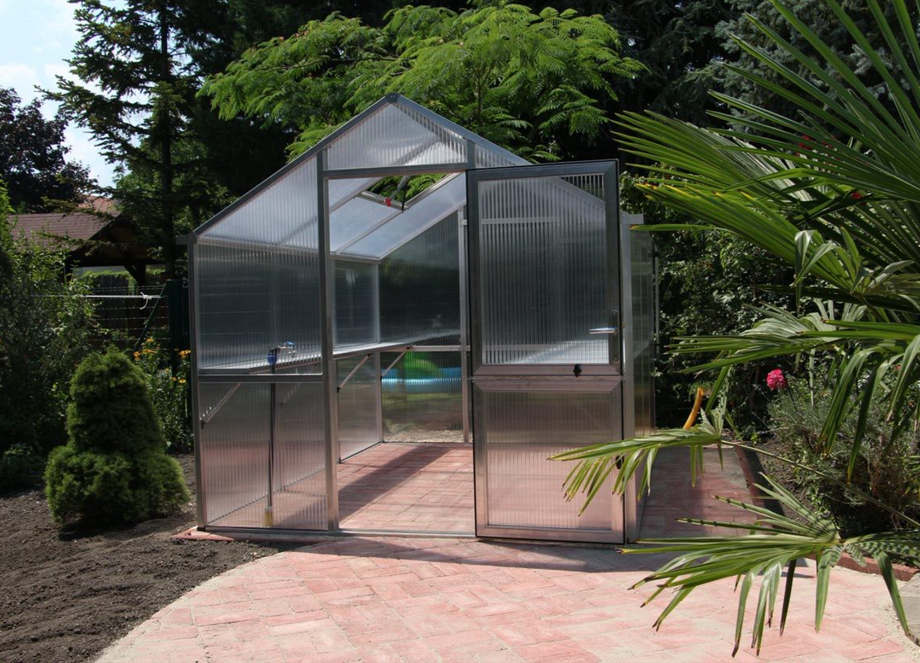 De 16mm kanaalplaten bieden uitzonderlijke isolatie en diffusie van licht, waardoor temperatuurverschillen en verbranding worden voorkomen. Het aluminium frame is licht, sterk en onderhoudsarm, geschikt voor jarenlang intensief gebruik. De kas is uitgerust met een brede draaideur, een automatisch dakraam, een handmatig achterraam en dubbele regengoten. Het optionele funderingsframe geeft extra stabiliteit, waardoor de Iris III ook bij harde wind betrouwbaar blijft.