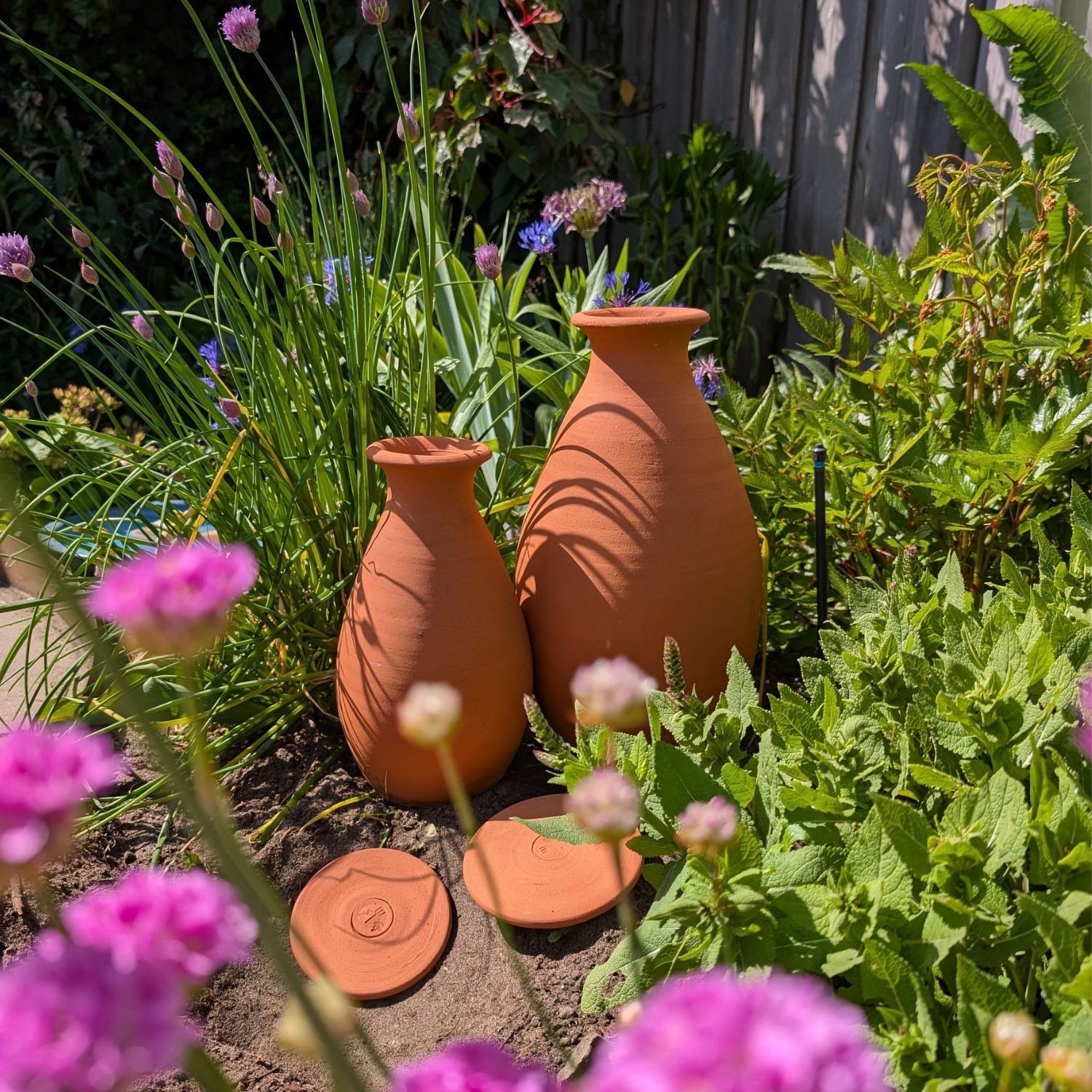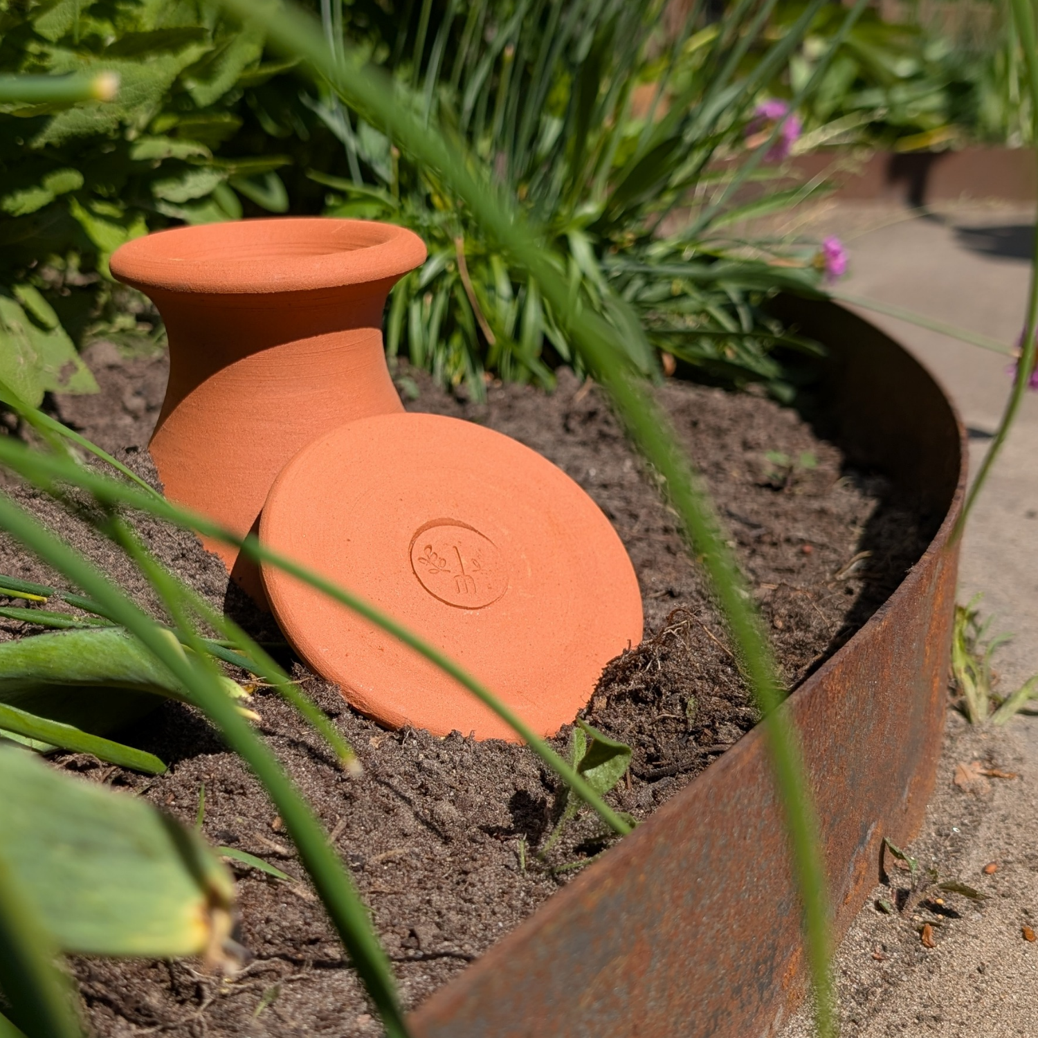 Diese Olla versorgt Pflanzen in einem Umkreis von 35cm um das Gefäss mit Wasser. Graben Sie die Olla bis zum Hals ein und achten Sie darauf, dass der Deckel etwas über das Bodenniveau hinausragt.