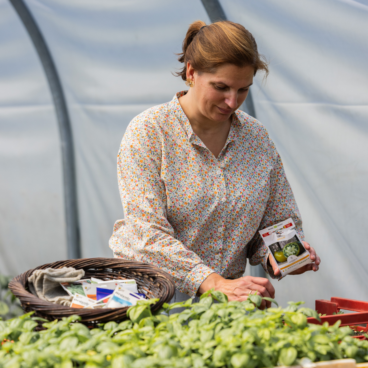 Sie verwenden den Korb ganz einfach, indem Sie ihn beim Ernten neben sich stellen oder ihn mit beiden Händen anheben. Durch die tiefe Form bleibt Ihre Ernte sicher an ihrem Platz, und Sie können zügig weiterarbeiten, ohne den Korb ständig leeren zu müssen. Die offene Flechtstruktur sorgt dafür, dass Erde und Feuchtigkeit leicht aus dem Korb fallen können – besonders praktisch bei Kulturen, die direkt vom Feld kommen.