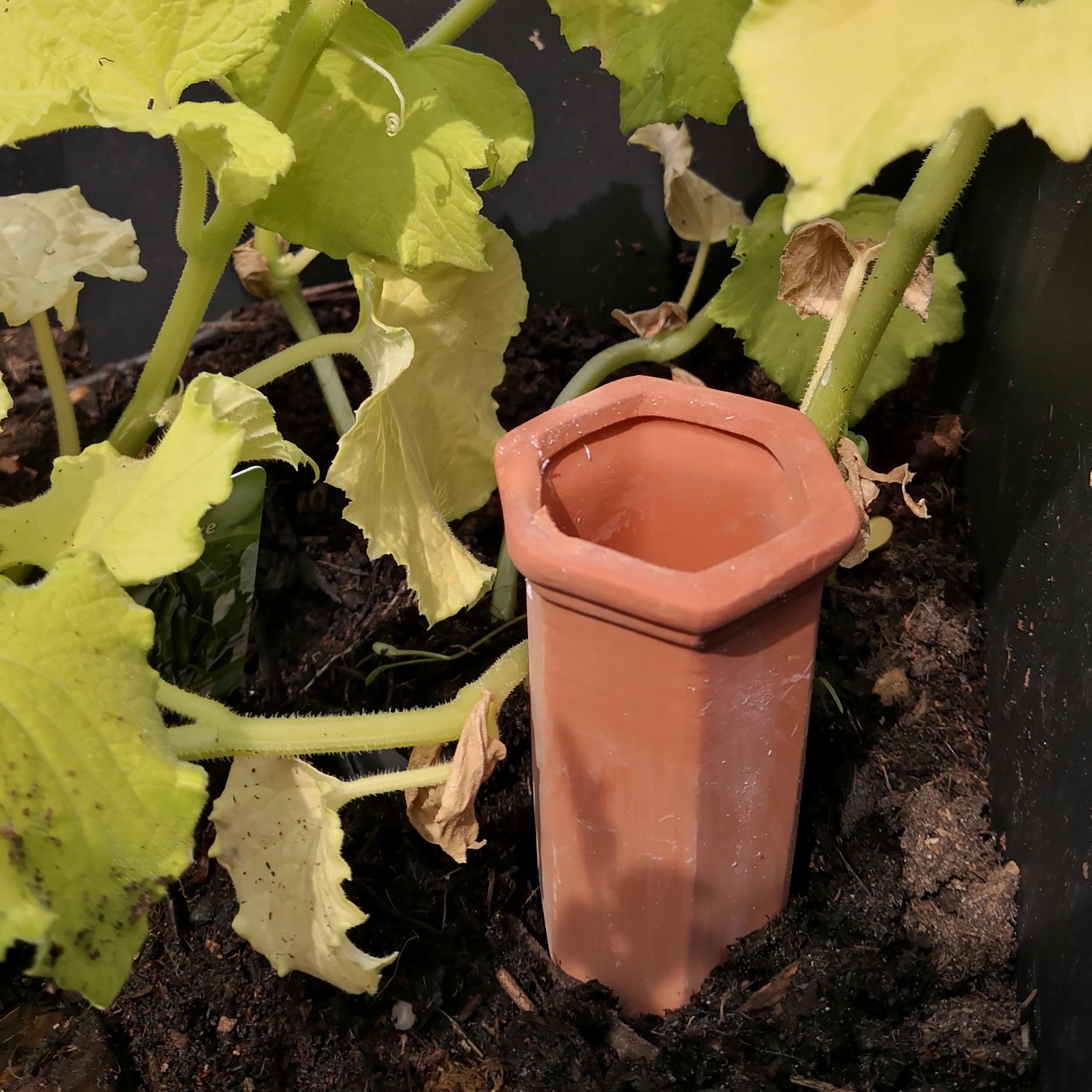 Het gebruik is bijzonder eenvoudig: vul de tonkegel met water, steek hem daarna diep genoeg in de grond naast je plant en laat het poreuze kleiwerk zijn werk doen. Het water zakt langzaam naar buiten en dringt direct door naar de wortels, waardoor de toplaag niet snel uitdroogt of onnodig wordt weggespoeld. Dit maakt de waterhulp ideaal voor potplanten, bloembakken, borders en terrasplanten.