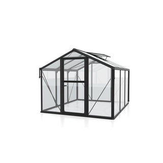 De kas heeft een degelijke aluminium constructie, gecombineerd met een innovatieve montage via aluminium klemprofielen: de panelen worden vastgeklemd tussen lijsten, wat de randen extra beschermt tegen vuil en slijtage. De beglazing is een combinatie van 10 mm kanaalplaat in het dak en 3 mm veiligheidsglas in de wanden — een sterke mix voor lichtinval én stabiliteit. Standaard heeft de kas regengoten, regenpijpen en één dakvenster, en de boerendeur ondersteunt natuurlijke ventilatie zonder dat je een deur volledig hoeft te openen.