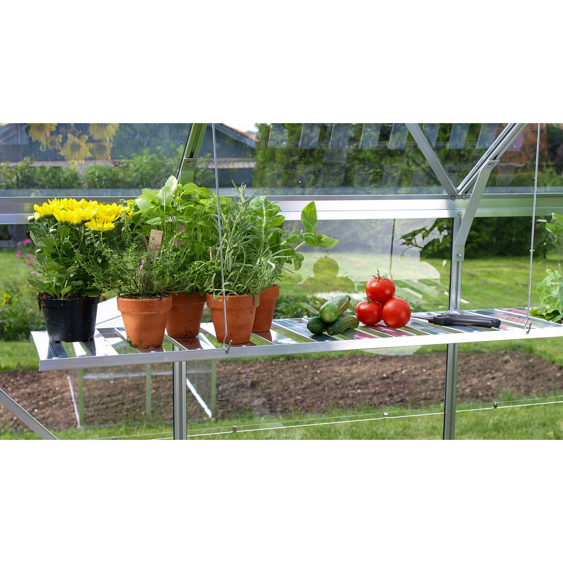 Het gebruik van de kweekplank is eenvoudig. Je bevestigt de plank stevig aan de wand van de Vitavia kas, waarna je hem naar wens kunt in- of uitklappen. Wanneer je extra ruimte nodig hebt om te zaaien of planten neer te zetten, klap je de plank eenvoudig uit. Ben je klaar of wil je meer loop- en werkruimte in de Vitavia kas, dan klap je hem weer omhoog. Zo houd je altijd overzicht en combineer je efficiënt werken met een opgeruimde kas.