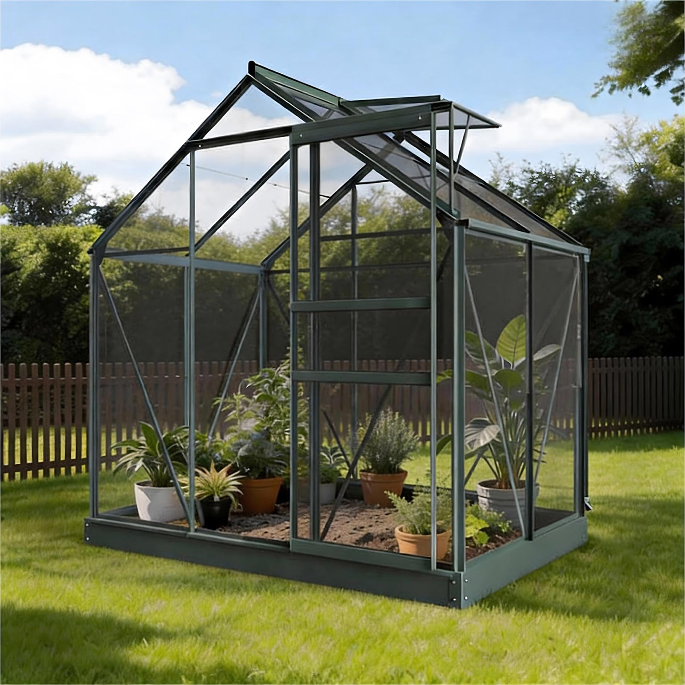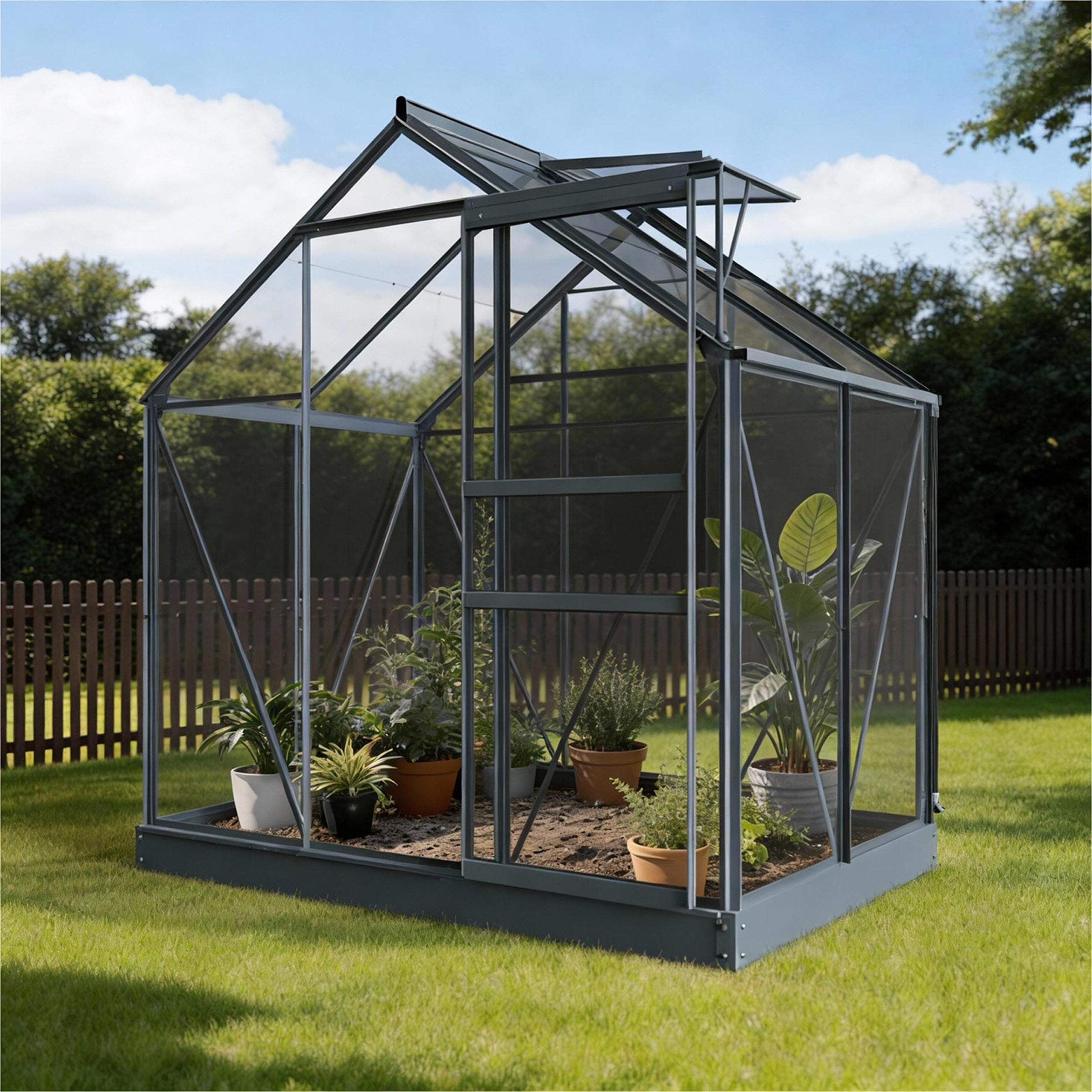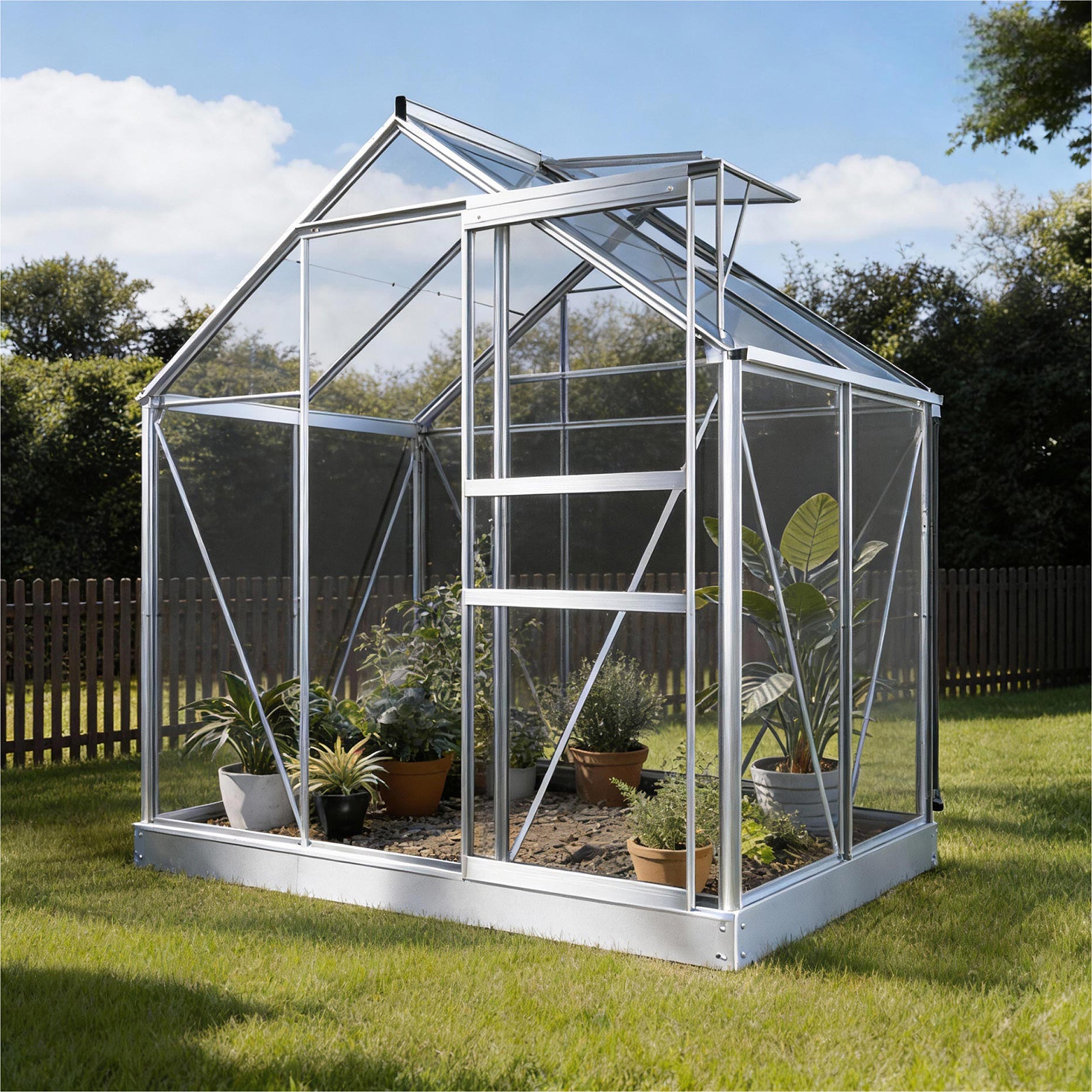Die Aluminiumkonstruktion wirkt solide und stabil, mit 3 mm Sicherheitsglas, das viel Licht durchlässt und sich leicht sauber halten lässt. Die Schiebetür und das Dachfenster sorgen für natürliche Lüftung und ein angenehmes Innenklima. Der Fundamentrahmen und der Regenwasserablauf sind standardmässig enthalten, sodass das Gewächshaus sofort einsatzbereit ist. Klein in den Abmessungen, gross in den Möglichkeiten.