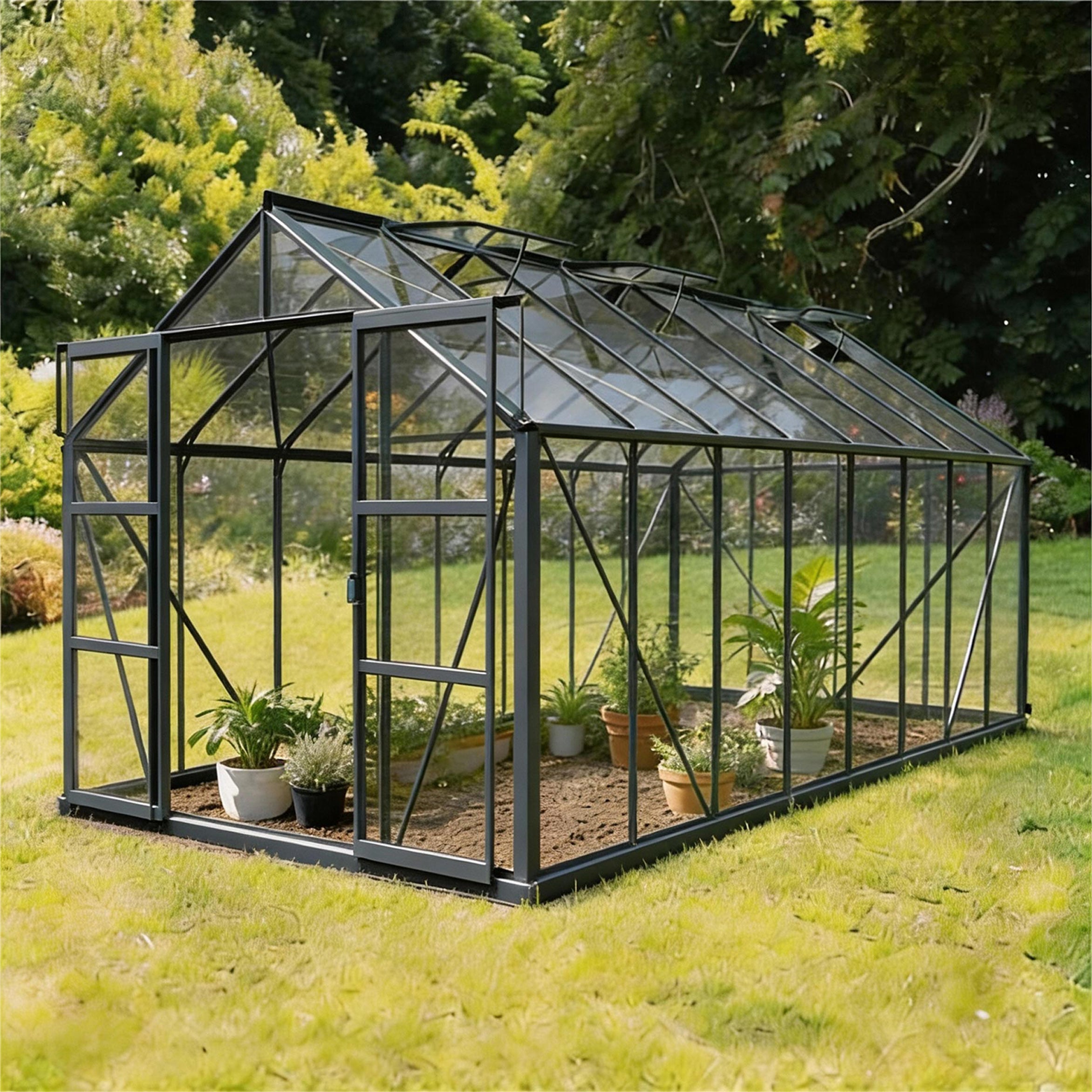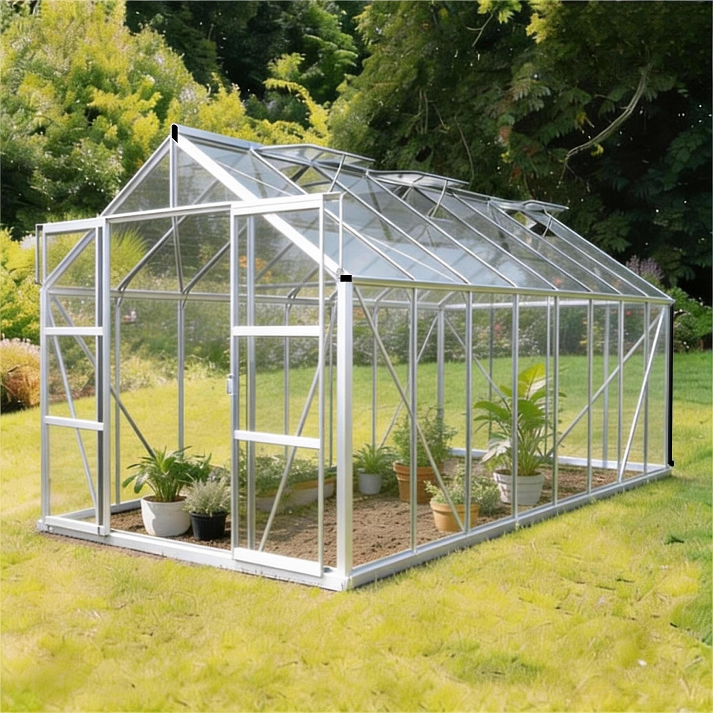 Die stabile Aluminiumkonstruktion mit Sicherheitsglas sorgt für ein verlässliches Innenklima, selbst bei wechselhaftem Wetter. Die doppelte Schiebetür bietet einen breiten Durchgang, und die sechs Dachfenster machen das Lüften einfach. Dank Fundamentrahmen und Regenwasserablauf ist dieses Gewächshaus vollständig ausgestattet – für viele Jahre Freude im Küchengarten.