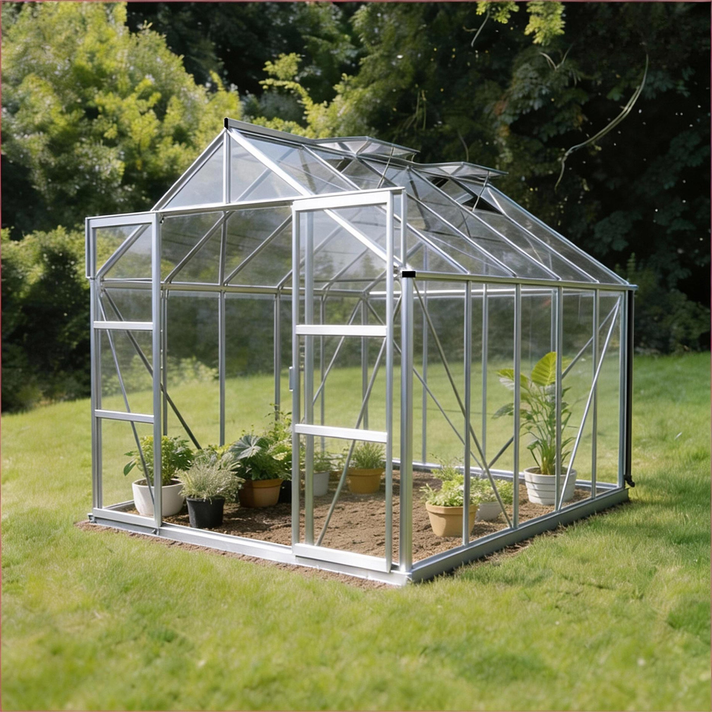 Die Aluminiumkonstruktion mit Sicherheitsglas sorgt für Stabilität und ein helles Anbauklima. Die doppelte Schiebetür macht den Durchgang breit und gut zugänglich, während die vier Dachfenster für Frischluft und Temperaturregelung sorgen. Der Fundamentrahmen und der Regenwasserablauf sind serienmässig enthalten, sodass das Gewächshaus viele Jahre lang wartungsarm bleibt.